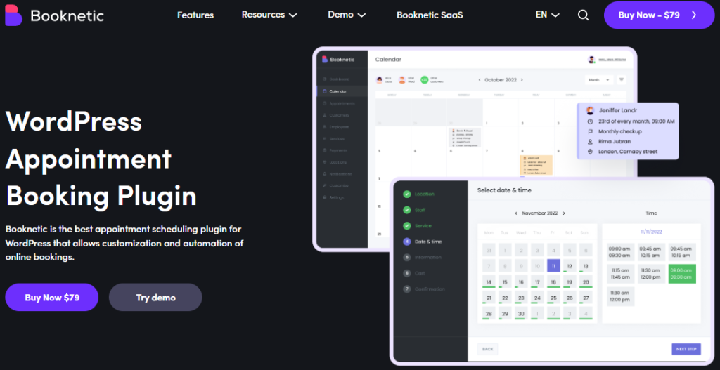 | Bookly Pro | Appointment Booking Plugin | Staff and Customer Appointments Easy Embedding Payment Integration | One time plan; $89 |