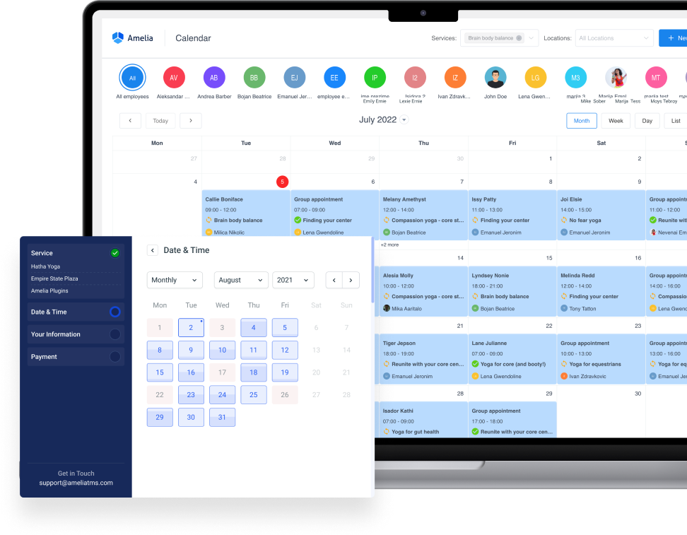 Amelia has been designed to help you manage all kinds of bookings. It’s great for managing appointments of all kinds and has a simple dashboard for managing individual and group bookings and recurring appointments.